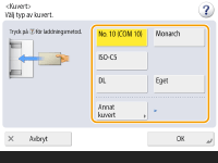 1 | Tryck på <Kuvert>. Pappersformatet Kuvert kan inte väljas på skärmen Detaljer för <Papperstyp>. Om du vill välja papperstypen Kuvert registrerar du papperstypen i <Registrera favoritpapper (universalfack)>, tryck sedan på <Favoritpapper> i steg 2 den knapp som papperstypen Kuvert har registrerats för <OK>. Registrera ofta använda pappersformat och typer för universalfacket |