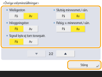 <Vilolägeston> | Ljud som skapas när maskinen går in i viloläge eller när maskinen stängs av om du ställer in <Inst. för snabbstart för huvudströmbrytare> på <På>. (Beroende på situation, startar inte maskinen snabbt och signalen ljuder inte.) |