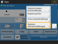 Antalet inställningsalternativ på skärmbilden med grundläggande funktioner för kopiering och platsen de visas på varierar beroende på funktionerna. En genvägsknapp visas inte om <Ej tilldelad> är inställd som en genväg. Begränsning för antalet genvägar för <Alternativ> som du kan registrera är enligt följande. Kopiering: 5 Fax: 4 Scanna och skicka: 2 |