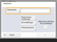 2 | Konfigurera de inställningar som behövs. ![]() <IKE-läge>Välj läge för nyckelutbytesprotokollet. Säkerheten förbättras om du väljer <Huvud> eftersom IKE-sessionen i sig är krypterad, men hastigheten för sessionen blir långsammare än med <Aggressiv>, som inte krypterar hela sessionen. <Autentiseringsmetod>Välj en av autentiseringsmetoderna som beskrivs nedan.