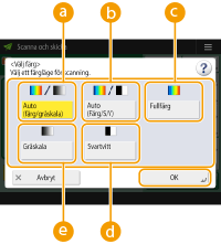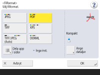 <PDF; Kont.&utjämn> är endast giltigt med följande inställningar: Välj färg: Ett annat färgarbetssätt än Svartvitt Upplösning: 300 dpi x 300 dpi <PDF; Kompakt> eller <XPS; Compact> är endast giltigt med följande inställningar: Välj färg: Ett annat färgarbetssätt än Svartvitt Upplösning: 300 dpi x 300 dpi <Word>-dokument som har inställningen <OOXML> kan bara skickas med följande inställningar. Välj färg: Ett annat färgarbetssätt än Svartvitt Upplösning: 300 dpi x 300 dpi <PowerPoint>-dokument som har inställningen <OOXML> kan bara skickas med följande inställningar. Välj färg: Ett annat färgarbetssätt än Svartvitt Upplösning: 300 dpi x 300 dpi eller 600 dpi x 600 dpi Om du väljer <PDF; Kont.&utjämn> kan det beroende på det scannade dokumentet hända att maskinen inte kan identifiera vilka delar som är text och grafik korrekt. Text och bakgrund i ett PDF-dokument som innehåller konturdata kan visas med dålig passning eller så kanske text och streckteckningar inte visas, beroende på vilken version av Adobe Illustrator som används för att öppna PDF-filen. När du skapar filer efter sidorOm du vill scanna ett original på flera sidor och spara varje sida som en separat fil i stället för att spara alla sidor som en enda fil, tryck på <Dela upp i sidor>. Om du vill ange hur många sidor som ska ingå i varje fil trycker du på <Dela upp i sidor> och anger önskat antal sidor. Om varje sida ska sparas som en separat fil anger du <1> för antalet sidor. Om du väljer <TIFF/JPEG> skapas varje sida automatiskt som en separat fil enligt arbetssättet Välj färg. Om Svartvitt är inställt för arbetssättet Välj färg: TIFF Om en annan inställning än Svartvitt är inställt för arbetssättet Välj färg: JPEG Du kan inte ange antalet sidor som ska ingå i en fil om du använder funktionen <Scanna och lagra>. |