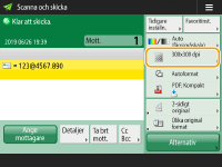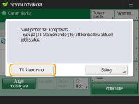 Om du vill kontrollera det totala antalet mottagare som har angettsDet totala antalet mottagare som har angetts visas högst upp till höger på skärmen. Det gör det möjligt för dig att bekräfta att antalet mottagare är korrekt före sändning. ![]() Omedelbart avbryta ett jobb som skickasOm du trycker på på kontrollpanelen när ett jobb skickas, visas meddelandet <Vill du avbryta följande sändjobb?>. Tryck på <Ja> för att avbryta sändningen.Du kan välja <Senast mottagna jobb> eller <Jobb som skickas> för att välja vilket jobb som ska avbrytas. <Jobb att avbryta när stopp väljs> Tryck på om det finns flera sändjobb på skärmen när du ska välja vilket jobb som ska avbrytas. Om sändjobbet du vill avbryta inte visas trycker du på <Kontrollera andra jobb> för att visa <Sändjobb>. Välj det jobb som ska avbrytas och tryck på <Avbryt>.För att kontrollera status för skickade/sparade dokumentPå skärmen <Statusmonitor> kan du kontrollera status för skickade/sparade dokument. På den här skärmen kan du skicka/spara dokument igen eller avbryta skickande/sparande efter kontroll av status. Kontrollera status och logg för scannade dokument När <Visa meddelande när ett jobb accepteras> är inställt på <På>, kan skärmen <Statusmonitor> visas från följande skärm som visas när ett sändjobb har tagits emot. <Visa meddelande när ett jobb accepteras> ![]() För att skriva ut rapporten för resultatet av sändning/sparaPå skärmbilden med grundläggande funktioner för scanning, tryck på <Alternativ> <TX resultatrapport> för att ange att rapporten för sändning/sparande ska skrivas ut automatiskt.Om du vill ställa in det här för varje jobb med <Alternativ>, måste du välja <Endast för fel> eller <Av> i <TX resultatrapport> och sedan ställa in <Tillåt utskrift från tillval> på <På>. FilnamnNär en fil har skickats/sparats, anges dess filnamn automatiskt efter följande format. Du kan ändra inställningen så att ett annat namn kan väljas. Ange ett filnamn När du skickar med e-post Formatet "Jobbnummer (fyra siffror)_sidnummer (tre siffror).filnamnstillägg", t.ex. "1042_001.jpg" När du sparar på en filserver Formatet "År, månad, dag, timme, minut och sekund då filen sparas (14 siffror).filnamnstillägg", t.ex. "20151030133541.jpg" E-postämneÄmnet som anges i <Standardämne> anges automatiskt i (<Standardämne>). Om du anger ett annat ämne, ändrar du inställningen, eller ange varje gång du skickar ett e-postmeddelande (Göra e-postinställningar). |