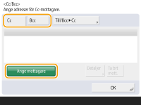 För att välja en mottagare från skärmen <Snabbval> efter scanning anger du <Snabbval> för <Standardskärm>. Arbetet som krävs för sändning av scannade dokument till samma mottagare kan minskas. <Skicka> De mottagare som har registrerats i snabbvalsknapparna för servermaskinen uppdateras i följande fall: När ett faxjobb har skickats på klientmaskinen När du trycker på återställningsknappen på klientmaskinen När autoåterställning har aktiverats på klientmaskinen |
