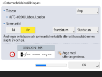 Ange maskinens datum- och tidsinställningar. ![]() ![]() Ange datum och tid och tryck sedan på <OK>. Ange <Tidszon> och <Sommartid> efter behov. För mer information, se Ställa in datum/tid. | |