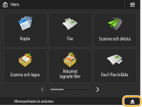 Kom ihåg att kontrollera innan du använder minnesenhetenFör att använda minnesenheten måste du sätta <Minnesenhet> i <Lagringsplats för visningsinställningar> till <På>. <Lagringsplats för visningsinställningar> Sätt <Använda scanningsfunktion> och <Använd utskriftsfunktion> till <På>. <Använd scannings-/utskriftsfunktion> Om minnesenheten inte identifieras även fast den är korrekt ansluten kan det hända att maskinen är inställd på att använda AddOn-drivrutinen för extern USB-lagringsenhet. Ställ in <Använd AddOn-drivrutin för USB-lagringsenhet> på <Av>. <Använd AddOn-drivrutin för USB-lagringsenhet> |