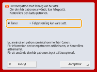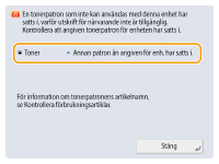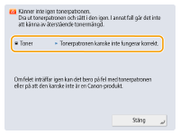 Starta om maskinen. Om meddelandet inte försvinner när du startar om maskinen, skriv ner meddelandet och kontakta din lokala auktoriserade Canon-återförsäljare.