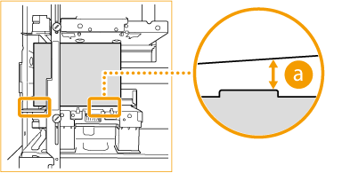 ) menší než 0,1 mm, upravte vzdálenost mezi destičkami pro nastavení velikosti tím, že povolíte šrouby ve tvaru mince na bližší straně, přidržíte vnější destičku pro nastavení velikosti tak, aby se nehýbala, a šrouby opět dotáhnete.Pokud jste upravili vzdálenost mezi destičkami pro nastavení velikosti, zkontrolujte, zda se stoh papíru nyní dotýká dvou či více hřebenů na levé stěně podstavce na papír.