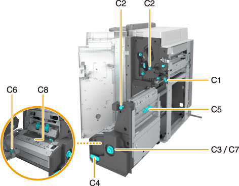 Otevřete pravý kryt jednotky sedlové sešívačky (C5).