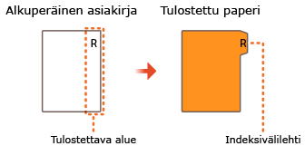 Voit lisätä arkit sisältösivujen väleihin. Esimerkiksi kun teet suuren määrän kopioita, voit vaivattomasti tarkistaa luovutettujen arkkien määrän lisäämällä värillisen paperin jokaisen 50 sivun jälkeen. Välilehtiä voi käyttää lukusivuina jos tulostat niille. Voit myös tulostaa indeksivälilehtien ulkonemiin ja lisätä indeksivälilehdet sivujen väliin.