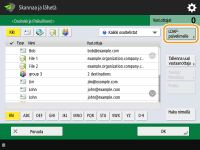 <Alkup. sisällön suunta> valitse <Yläreuna takana> tai <Yläreuna sivulla> alkuperäisen suunnan mukaan valitse <OK>.Useiden vastaanottajien määrittäminen, mukaanlukien faksitJos <Salli faksi skannausja lähetystoiminnassa> -asetuksena on <Kyllä>, voit määrittää faksivastaanottajat skannauksen perustoimintonäytössä (<Näytä faksitoiminto>). Tämä asetus on hyödyllinen kun määritetään useita vastaanottajia mukaanlukien fakseja, kuten tallennettaessa kopiota lähetetystä faksista tiedostopalvelimeen.