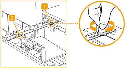 ) minder is dan 0,1 mm, stel dan de afstand tussen de formaatwisselplaten opnieuw in door de schroef aan de dichtstbijzijnde kant los te draaien en draai de schroef vervolgens weer vast terwijl u de buitenste formaatwisselplaat vasthoudt om te voorkomen dat deze beweegt.Als u de afstand tussen de formaatwisselplaten hebt aangepast, controleer dan of de stapel papier contact maakt met twee of meer van de ribbels aan de linkerkant van het papiermagazijn.