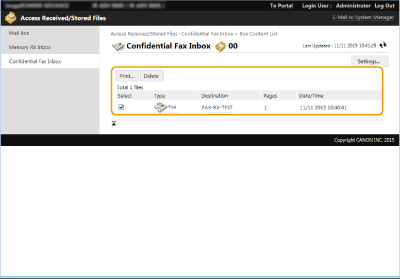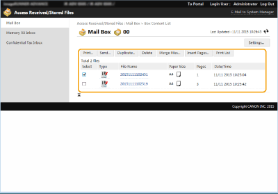 U kunt de Remote UI (UI op afstand) gebruiken om bestanden die zijn opgeslagen in het postvak, of faxen en I-faxen die tijdelijk zijn opgeslagen in het fax-/I-faxpostvak, af te drukken, te verzenden of te verwijderen.
