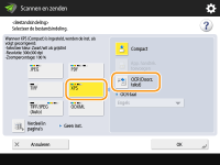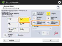 Als u als bestandsindeling <PDF> of <XPS> selecteert, kunt u <Compact> en <OCR (Doorzoekbare tekst)> tegelijk instellen. In dat geval wordt <PDF (Compact)> of <XPS (Compact)> weergegeven als bestandsindeling op het scherm met basisfuncties voor scannen en verzenden.