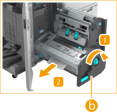 Als de Document Insertion Unit-N naast de finisher is aangesloten, kan een deel van de documentinvoegeenheid de finisher in de weg staan bij het verhelpen van papierstoringen. Til de documentinvoegeenheid eerst op voordat u het vastgelopen papier uit de finisher verwijdert.