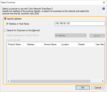 Naciśnij na [Specify Address] i wprowadź adres IP urządzenia lub nazwę hosta urządzenia w polu tekstowym [IP Address or Host Name].