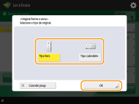<Orientação Conteúd. Orig> selecione <Prte sup ext dist> ou <Prte sup. extrem.> de acordo com a orientação do original carregue em <OK>.Especificar vários destinos, incluindo faxProgramar <Ativar fax na função Ler e Enviar> para <Ligado> permite especificar destinos de fax a partir do ecrã das funções básicas de leitura (<Mostrar função de fax>). Esta programação é útil para especificar vários destinos, incluindo fax, tais como gravar a cópia de um fax enviado num servidor de ficheiros.