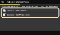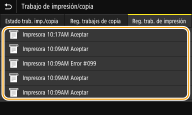Si <Mostrar registro de trabajos> está establecido en <Off>, no podrá consultar los registros de impresión. <Mostrar registro de trabajos> |