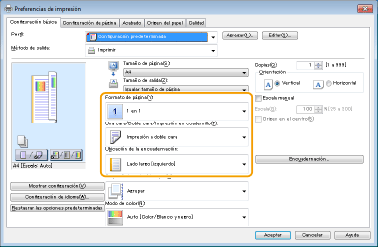 3 | Mientras comprueba la vista preliminar de impresión, configure [Formato de página] [Orden de páginas] [Una cara/Doble cara/Impresión en cuadernillo] [Ubicación de la encuadernación]. |