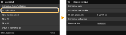 Vous pouvez modifier un grand nombre de réglages relatifs à l'affichage tels que la langue d'affichage : <Réglages d'affichage> Pour changer l'écran qui s'affiche automatiquement en cas d'inactivité de l'appareil pendant le laps de temps défini : <Fonction après réinitialisation auto.> Vous pouvez modifier les différents réglages relatifs à l'opérabilité tels que la luminosité de l'écran : <Accessibilité> |