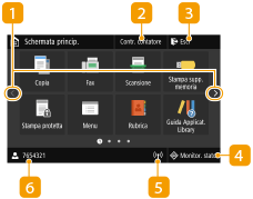 sul pannello operativo. Utilizzare questa schermata per specificare le impostazioni e per registrare le funzioni.![]() | Cambio paginaUtilizzare questo pulsante per visualizzare un'altra pagina nella schermata Schermata principale. È anche possibile usare lo scorrimento laterale per cambiare le pagine. <Contr. contatore>Visualizza i totali per le stampe a colori e in bianco e nero separatamente. Visualizzazione del valore del contatore <Esci>Utilizzare questo pulsante per uscire dalla macchina. <Monitor. stato>Selezionare se controllare lo stato di stampa, visualizzare la cronologia d'uso o le impostazioni di rete come l'indirizzo IP della macchina. È inoltre possibile controllare lo stato della macchina, come la quantità di carta e toner rimanenti o la presenza di eventuali errori. Schermata <Monitor. stato> Icona Wi-FiVisualizzata quando la macchina è collegata a una LAN wireless. Nome utente/IDVisualizza il nome o ID dell'utente che ha effettuato l'accesso. | |