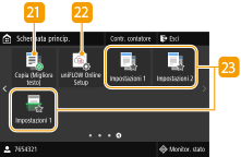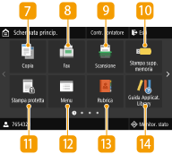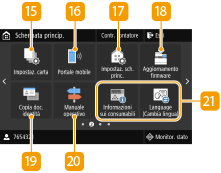 ![]() | <Impostaz. carta>Questo pulsante è utilizzato anche per specificare il formato e il tipo di carta caricata nel cassetto della carta e nel vassoio multiuso. Indicazione di formato e tipo di carta <Portale mobile>Consente di stabilire una connessione con un dispositivo mobile. Connessione a dispositivi mobili <Impostaz. sch. princ.>Consente di cambiare l'ordine di visualizzazione dei pulsanti nella schermata Schermata principale. Personalizzazione della schermata Schermata principale <Aggiornamento firmware>Permette sempre di aggiornare il firmware tramite Internet. Aggiornamento del firmware <Copia doc. identità>Utilizzare questa funzione per copiare il fronte e il retro di una patente o di un altro documento sullo stesso lato di una pagina. Copia di documenti di identità <Manuale operativo>Selezionare se visualizzare la guida per le operazioni e le cause/soluzioni degli errori. | |