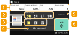 Viene visualizzato lo stato delle varie impostazioni, come il rapporto di riproduzione, la carta per la copia e il numero di copie. Per effettuare copie in modo corretto, verificare le impostazioni visualizzate qui. Per modificare un'impostazione, selezionare la voce desiderata.