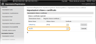 Fare clic su [Nome chiave] o [Certificato] richiesto per registrare il certificato.