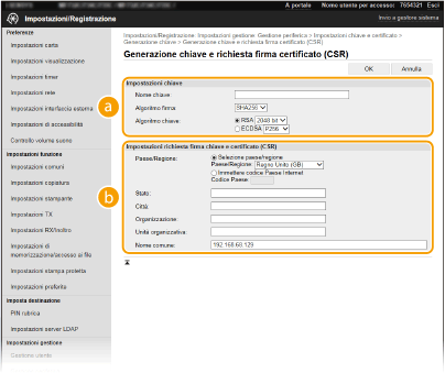Poiché i certificati generati sulla macchina non hanno una firma CA, potrebbe verificarsi un errore di comunicazione in base ai dispositivi con cui comunica. Affinché l'autorità di certificazione emetta il certificato con la firma CA, è necessario ottenere i dati di CSR (Certificate Signing Request), che l'amministratore può generare dalla IU remota. Una volta emesso il certificato, registrarlo nella chiave con la CSR generata.