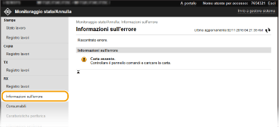 Se si verifica un errore, viene visualizzata questa pagina facendo clic sul messaggio visualizzato in [Informazioni sull'errore] nella pagina Portale (pagina principale).