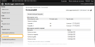 Vengono visualizzati il formato e il tipo di carta nell'alimentazione, il numero del modello della cartuccia del toner e altre informazioni. È possibile anche fare clic su [Verifica dettagli consumabili] nella pagina Portale (pagina principale) per visualizzare questa pagina (