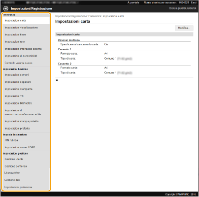 È possibile modificare le varie impostazioni della macchina tramite la IU remota. È inoltre possibile configurare la maggior parte delle impostazioni sulla macchina, ma per alcune è possibile utilizzare solo la IU remota. In questa sezione viene descritto il flusso di lavoro base per modificare le impostazioni della macchina usando la IU remota.