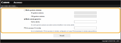 Selezionare [Modo gestore sistema] o [Modo utente generico], quindi immettere [PIN di accesso IU remota] se necessario.