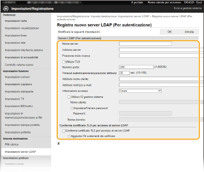 La registrazione del server LDAP prevede la separazione per ricerca o autenticazione. Per utilizzare un server LDAP per la ricerca di destinazioni fax ed e-mail, registrarlo per la ricerca, mentre per utilizzarlo per l'autenticazione nell'invio di e-mail o fax, registrarlo per l'autenticazione.