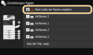 Nach dem Speichern der Standardpapiereinstellungen wird der Bildschirm zum Einstellen des Papiers beim Einlegen von Papier nicht mehr angezeigt, und es wird immer dieselbe Einstellung verwendet. Wenn Sie Papier in einem anderen Format oder eines anderen Typs einlegen, ohne die Papiereinstellungen zu ändern, druckt das Gerät möglicherweise nicht einwandfrei. Um dieses Problem zu vermeiden, wählen Sie <Beim Laden des Papiers angeben> in Schritt 3, und legen Sie dann das Papier ein. |