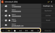 ![]() | Sie können häufig verwendete Empfänger für Faxen und Scannen im Adressbuch speichern und bei Bedarf mühelos auswählen (Speichern von Empfängern im Adressbuch). Sie können die Empfänger alphabetisch in Listen im Adressbuch suchen, oder Sie können eine dreistellige Nummer (Nummer für kodierte Wahl) eingeben. Außerdem können Sie die Empfänger mit den folgenden Funktionen besonders schnell angeben. |