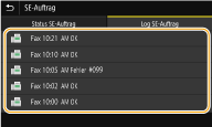 So zeigen Sie die Kommunikationslogs für gesendete und empfangene Dokumente an1 | Wählen Sie das Dokument, dessen Log Sie in der Registerkarte <Log SE-Auftrag> oder <Log EM-Auftrag> überprüfen möchten. <OK> wird angezeigt, wenn ein Dokument erfolgreich gesendet oder empfangen wurde, und <Fehler> wird angezeigt, wenn ein Dokument nicht gesendet oder empfangen werden konnte, da es abgebrochen wurde oder ein Fehler aufgetreten ist. ![]() Zeigt die detaillierten Informationen zum Dokument an. ![]() Wenn eine dreistellige Zahl im Fall von <Fehler> angezeigt wird Diese Zahl ist ein Fehlercode. Gegenmaßnahmen für den jeweiligen Fehlercode |