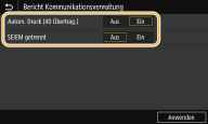 Wählen Sie <Ein>, wenn der Bericht automatisch nach jeweils 40 Übertragungen gedruckt werden soll, oder <Aus>, wenn der Bericht nicht automatisch gedruckt werden soll.