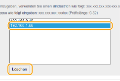 Wenn [Zurückweisen] für einen Ausgangsfilter ausgewählt ist Ausgehende Multicast- und Rundsendepakete können nicht gefiltert werden. Löschen einer IP-Adresse aus den Ausnahmen Wählen Sie eine IP-Adresse, und klicken Sie auf [Löschen]. |