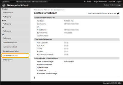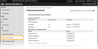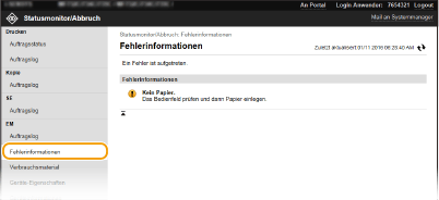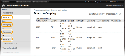 Unabhängig von der Einstellung für die Verwaltung per Abteilungs-IDs werden alle Druckdokumente aufgelistet, die gerade gedruckt werden oder sich in der Druckwarteschlange befinden. Wenn Sie bei der Anmeldung im Allgemeinen Benutzermodus Ihren Benutzernamen eingegeben haben, wird ihr Benutzername nur für die von Ihnen gedruckten Dokumente angezeigt. Klicken Sie bei den angehaltenen Dokumenten und geschützten Dokumenten auf [Auftragsnummer], um ausführliche Informationen anzuzeigen. Sie können den Benutzernamen und den Seitenzähler des gedruckten Dokuments überprüfen. |