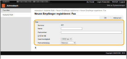 Sie können auch [ECM SE] und [SE-Startgeschwindigkeit] über <Faxeinstellungen> ( <Senden>) auf dem Bedienfeld festlegen. Die über <Adressbuch> vorgenommenen Einstellungen werden jedoch für die detaillierten Einstellungen von im Adressbuch gespeicherten Empfängern aktiviert. |
