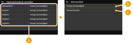 <Mehrzweckfach> <Vorrang Geschwindigkeit>  <Vorrang Druckseite> <Kassette 1> <Vorrang Geschwindigkeit>  <Vorrang Druckseite> <Kassette 2> <Vorrang Geschwindigkeit>  <Vorrang Druckseite> <Kassette 3>*1 <Vorrang Geschwindigkeit>  <Vorrang Druckseite> <Kassette 4>*1 <Vorrang Geschwindigkeit>  <Vorrang Druckseite> |