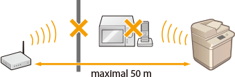 ![]() | ![]() | Überprüfen Sie den Aufstellungsort des Geräts und des Wireless LAN-Routers. Steht das Gerät zu weit vom Wireless LAN-Router entfernt? Gibt es Hindernisse, wie Wände, zwischen dem Gerät und dem Wireless LAN-Router? Gibt es Geräte, wie Mikrowellengeräte oder digitale Schnurlostelefone, die in der Nähe des Geräts Funkwellen abgeben? ![]() | ||