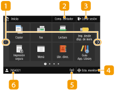 en el panel de control. Utilice esta pantalla para especificar la configuración y registrar funciones.![]() | Cambiar de páginaUtilícelo para ver otra página de la pantalla Inicio. También puede deslizar el dedo lateralmente para cambiar de página. <Comp. contador>Muestra el número total de impresiones en blanco y negro y en color por separado. Visualización del valor del contador <Cerrar sesión>Utilice este botón para cerrar la sesión en el equipo. <Esta. monitor>Seleccione para verificar el estado de la impresión, para ver el historial de uso o para ver las opciones de red, como puede ser la dirección IP del equipo. Asimismo, podrá comprobar el estado del equipo como, por ejemplo, la cantidad restante de papel y el tóner, o si se ha producido algún error. Pantalla <Esta. monitor> Icono Wi-FiAparece cuando el equipo está conectado a una LAN inalámbrica. Nombre/ID de usuarioSe mostrará el nombre o ID del usuario que ha iniciado una sesión. | |