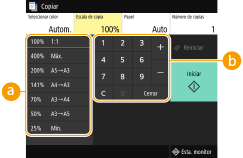 <Tipo orig./acab.>![]() | Puede ampliar o reducir las copias utilizando una escala de copia preestablecida, como por ejemplo <A5->A4> o estableciendo una escala de copia personalizada en incrementos del 1%. |