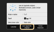 1 | Coloque el original siguiente sobre el cristal de la platina y seleccione <Leer siguiente original>. También podrá especificar <Seleccionar color>, <Tipo de original>, <Densidad> y <Balance de color> para cada original por separado. ![]() Repita este paso hasta que termine de escanear todo el original. |