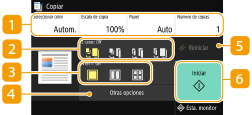 Se muestra el estado de configuración, como la escala de copia, el papel de copia y el número de copias. Para copiar correctamente, asegúrese de comprobar las opciones que se muestran aquí. Cuando quiera cambiar una opción, seleccione el elemento que va a configurar.