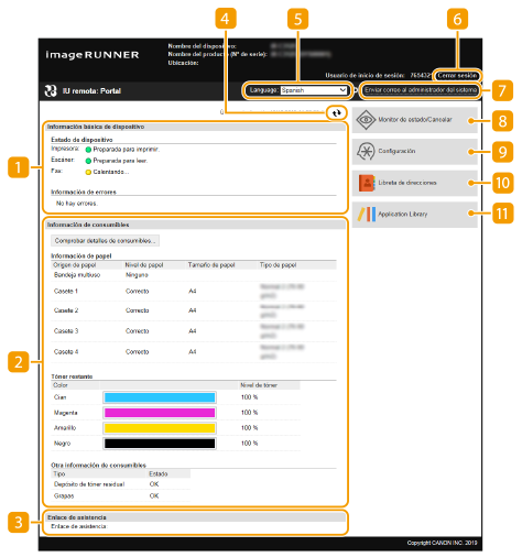 Al iniciar sesión en la IU remota aparece la siguiente página del Portal. En esta sección se describen los elementos que aparecen en la página del Portal y las operaciones básicas.