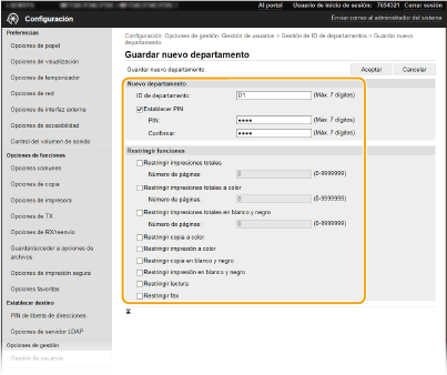 Registre un ID de departamento y establezca un PIN para ese ID. Registre todos los ID de departamento que haya que administrar.