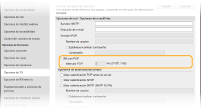 Utilice la IU remota para configurar las opciones detalladas de envío y recepción, como pueden ser las opciones para utilizar el equipo para enviar y recibir I-Faxes y las opciones para la autenticación POP y el cifrado de la comunicación antes de enviar e-mails o I-Faxes. Póngase en contacto con su proveedor o administrador de red para obtener la configuración necesaria.