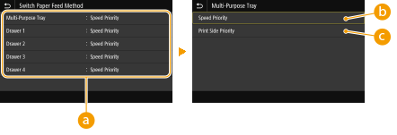<Multi-Purpose Tray> <Speed Priority>  <Print Side Priority> <Drawer 1> <Speed Priority>  <Print Side Priority> <Drawer 2> <Speed Priority>  <Print Side Priority> <Drawer 3>*1 <Speed Priority>  <Print Side Priority> <Drawer 4>*1 <Speed Priority>  <Print Side Priority> |